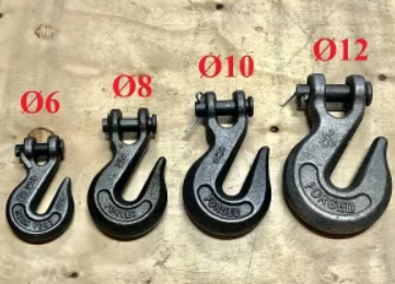 Clevis grab hook có nhiều kích thước khác nhau để phù hợp với các loại xích nâng. Một số thông số phổ biến gồm: