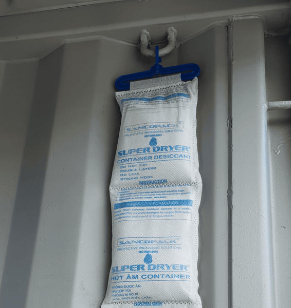 Các gói chống ẩm treo container Super Dryer của Sancopack thường được đặc hoặc treo trong các container giúp ngăn chặn sự ngưng tụ hơi nước trên thành và mái container.